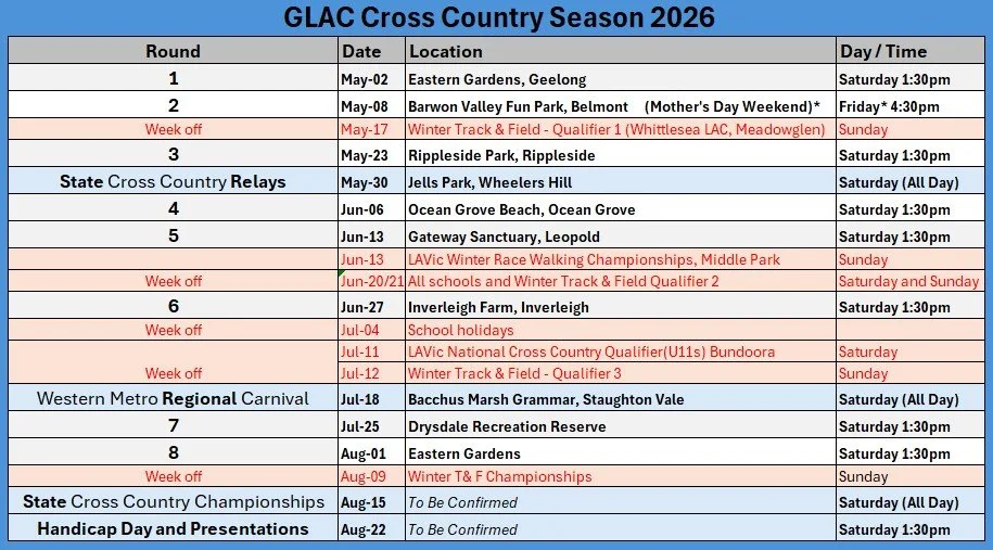 Cross Country 2026 will start Saturday 2nd of May 2026 and run mainly Saturday afternoons, at various locations around Geelong